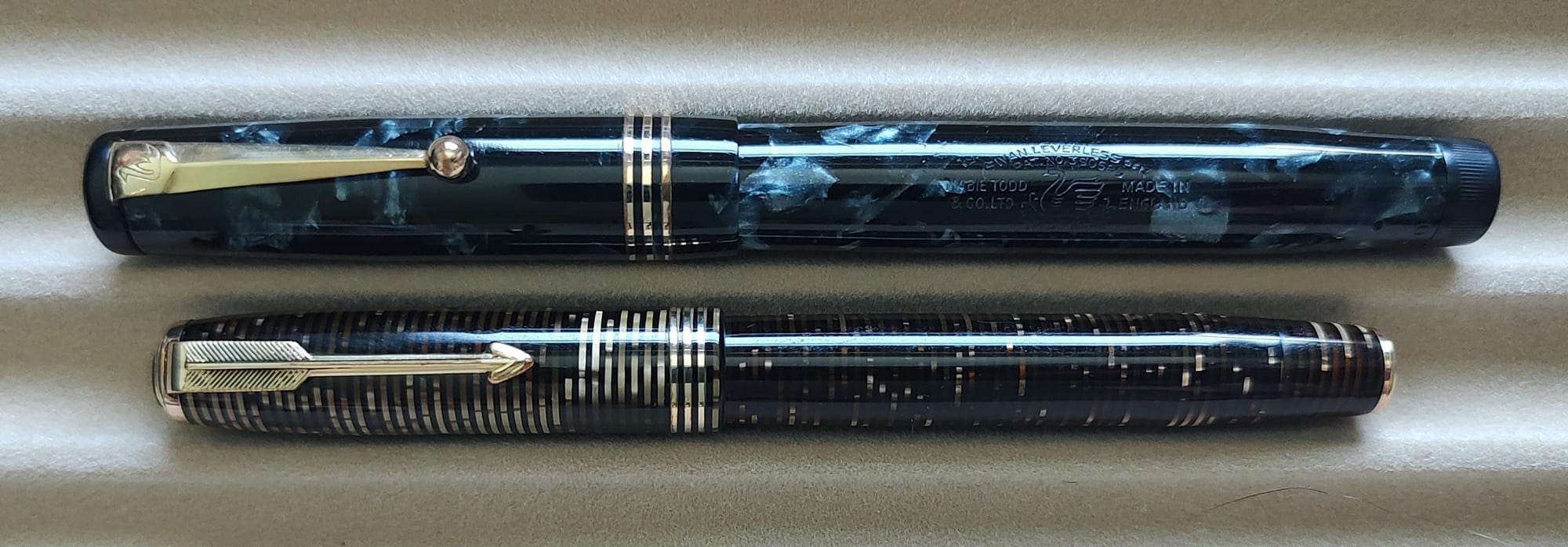 Two characteristics that set vintage and antique pens apart from modern pens are that they often use materials and filling systems which are not commonly used in modern pens. Materials seen in vintage pens which are no longer commonly used include hard rubber (also known as ebonite), celluloid, and casein. As far as filling systems, use of cartridges or converters in vintage pens is rare before the 1960s, and instead you will often see filling systems such as aerometric, vacumatic, lever filler, button filler, touchdown, or other sac-based filling systems.