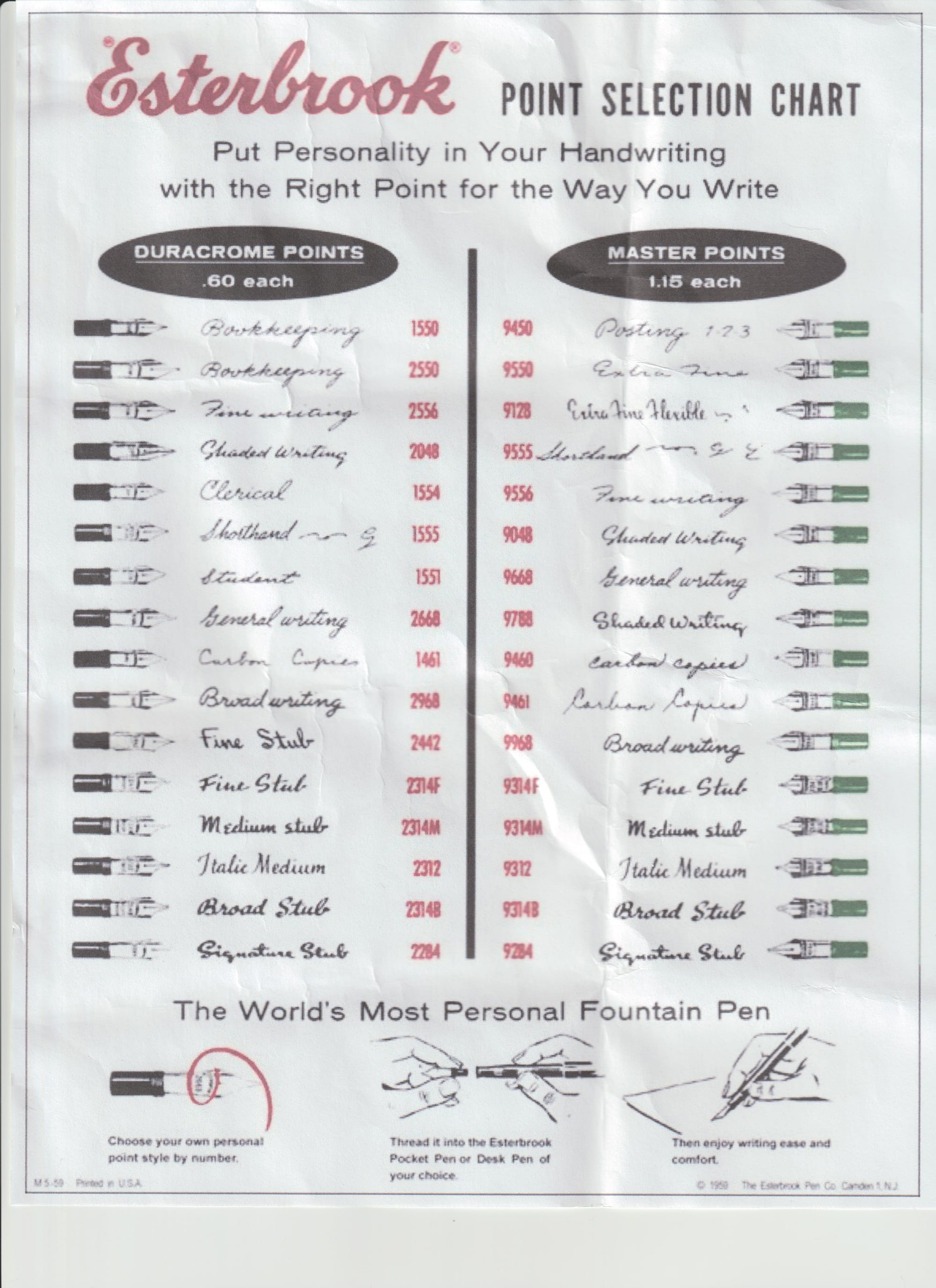 London pen company Mentmore introduced the first interchangeable nib units in 1925 with their Platignum brand pens. It’s my speculation that Esterbrook company, having English roots, acquired this knowledge and began making interchangeable nib units for their pens. These nib units came in two main versions — Durachrome Points and Master Points. The difference is that the tipping on Master Points (9xxx) was manufactured from iridium, the most corrosion-resistant metal known at the time. Tipping on Durachrome points were unfolded steel (1xxx) and folded steel (2xxx). For both versions, Esterbrook manufactured 16 different nib points. For a short time, Esterbrook manufactured points with 3xxx and 8xxx numbers. Tipping material on these points was made from osmiridium, an alloy of Platinum group metals.