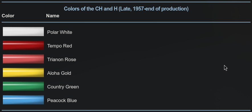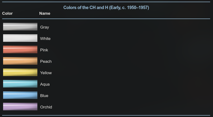 CH and H models came in a variety of pastel colors. J, LJ, and SJ models came in many marbled colors. The later J Deluxe came out in 1950 and had steel caps.
