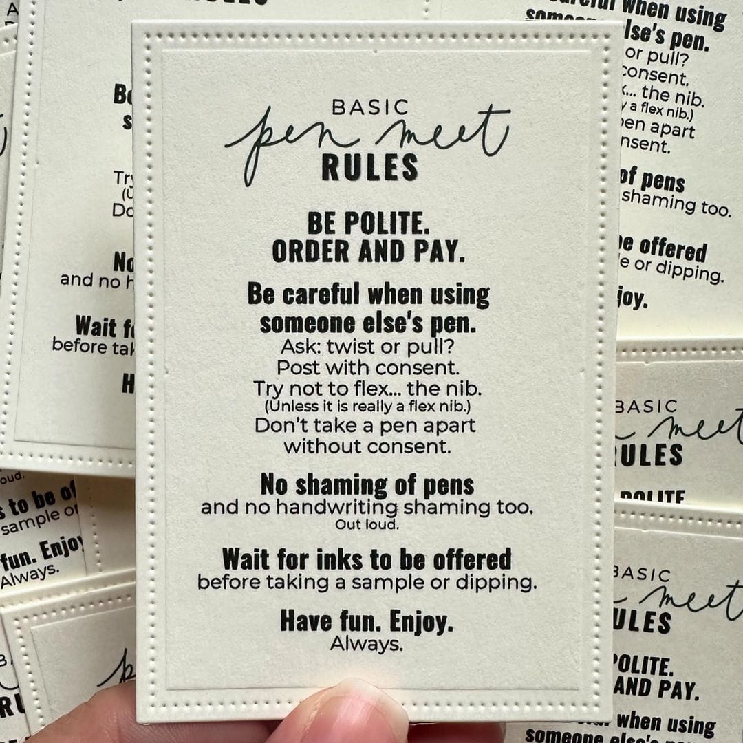 We have a time-honored ritual at pen meets of having people sign in our notebooks identifying their pen and ink, so we can make new friends and go home with writing samples. Newbies are sometimes handed a "pen meet etiquette" card so they will know how to request to try another member's pen or ink and handle it carefully.